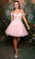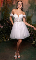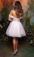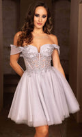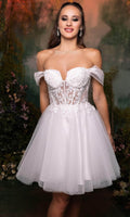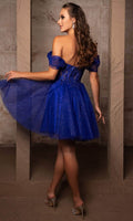 Bring a breathtaking new look to prom night in this endearing May Queen MQ211 cocktail dress. Have a blast on your special night when you wear this dress which features a captivating off-shoulder neckline on an illusion corset top. It also reveals a classy mid-open back that is secured by a zipper for a refined finish. The top exhibits floral embroidery designs, while the shimmering A-line skirt is fully adorned with glitters. Bloom with loveliness in this detailed May Queen MQ211 masterpiece. Models are wearing Blush, Champagne, Dusty Blue, Off White, Royal Blue, and Silver colors.