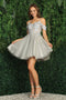 Feel confident and beautiful in Adora Design 1051's Sequin Applique Short Off-Shoulder Dress. Show off an alluring combination of sweetheart bodice and corset boning with its off-shoulder illusion design. Back features lace-up closure with a discreet zipper. The A-line mini skirt has multiple tiered layers for added volume. Bra cup and fully lined. Available in red, black, navy blue, and emerald green, in sizes XS to 2XL. Perfect for semi-formal, homecoming, cocktail party, Damas court, prom, graduation, wedding guest, special occasion, and military/Marine ball.