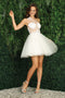 Be the center of attention in this alluring embroidered lace applique short sleeveless sheer corset dress with an A-line glitter tulle skirt by Adora Design 1039. Adora 1039 brings sophistication with this dress featuring a sleeveless illusion sweetheart bodice with corset boning and spaghetti straps. A zipper closure with an open lace-up back adds a special charm. The short A-line mini skirt highlights the ensemble. Details: Bra Cup, Fully Lined Fit: Model is 5'8" and wearing 4" heels Note: Glitter may shed due to the fabric's nature Colors: Silver, Champagne Sizes: X-Small to 3X-Large Occasions: Semi-Formal, Homecoming, Cocktail Party, Damas Court, Prom, Graduation, Wedding Guest, Special Occasion, Military/Marine Ball, Plus Size, Curvy