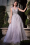 Beaded long silver dress with A-line skirt Cinderella Divine B710 is one that you’re bound to fall in love with. It features a high illusion neckline adorned in beads and a thin belt at the waist. The perfect mix of elegance and modern style.