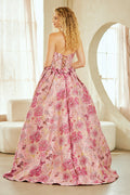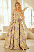 Make a stunning entrance in this Amelia Couture 8068 off-shoulder ball gown, designed to turn heads at any formal occasion. The elegant brocade print fabric drapes beautifully in an A-line silhouette, while the strapless scoop neckline and corset-boned bodice create a flattering, sculpted look. An open lace-up back with zipper closure adds dramatic flair, and the floor-length skirt with graceful train ensures you'll command attention. Fully lined with a bra cup for comfort and support, this gown is perfect for proms, galas, red carpet events, and black-tie affairs. Available in champagne, dusty mint, pink, and yellow in sizes 0-14.