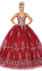 Showing off a gorgeous lace bodice, this ballgown captivates with rhinestones for artistry and grace. The corset back creates a cinching affect to enhance your curves, while the flared skirt gives you an ethereal ballgown vibe.