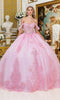 Elegant black quinceanera gown featuring intricate multi-color floral appliques adorning the corset bodice. The design includes a practical adjustable tie back closure and showcases a luxurious ball gown silhouette crafted from shimmering glitter tulle.