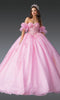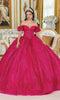 Dazzle at your celebration in this playful off-the-shoulder quinceanera gown! The corset bodice hugs your figure while sparkling sequin lace adds magic. A cheeky bow adorns the back, and the glitter tulle skirt poofs out in perfect ball gown fashion, ready for twirling the night away!