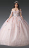 Shimmering tulle quinceanera gown featuring elegant off-shoulder draped straps complementing a transparent corset bodice. Adorned with intricate sequin appliques and finished with a statement bow detail at the back.