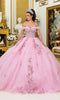 Dazzle at your celebration in this flirty pink off-shoulder gown! The see-through corset bodice creates magical allure, while playful 3D flowers and delicate lace appliques add that perfect touch of whimsy. Turn heads with the adorable bow detail that makes your grand exit just as stunning as your entrance!