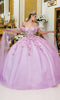 Exquisite light pink quinceanera gown featuring elegant draped off-shoulder straps complementing a refined sweetheart neckline. The structured corset bodice is adorned with intricate lace appliques, subtle glitter accents, and dimensional 3D floral embellishments for sophisticated visual depth.