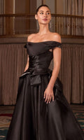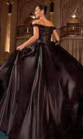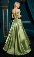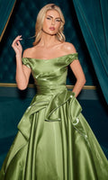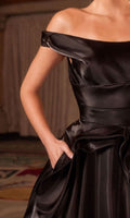 Off-the-shoulder satin prom gown by Ladivine with a fitted bodice, a straight neckline, and a back zipper closure. The long voluminous a-line skirt includes a layering detail at the natural waist as well as side pockets.