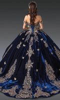 Make an unforgettable impression in the Dancing Queen 1931 gown, a luxurious velvet creation fit for royalty. Featuring metallic embroidery with ornate baroque patterns and 3D butterfly embellishments, this gown evokes elegance and grace. The off-shoulder design and sweetheart neckline bring timeless femininity, complemented by sparkling beadwork throughout. Finished with a lace-up back for a customizable fit, the Dancing Queen 1931 creation promises a show-stopping entrance at your grand celebration. Model is wearing Navy color.