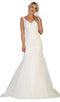 May Queen RQ7823: Look feminine and remarkable in this embroidered dress featuring a plunging neckline, sheer inset, fitted bodice, strappy back, and a sweep train. Available in an ivory color.