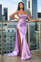 This glittering strapless dress is destined to be the belle of your ball. Featuring a gathered sleeveless bodice with an open back, and a leg slit, this stunning formal evening gown has a sweep train.
