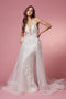- Off the shoulder deep illusion V-neck bodice secured with cap sleeves