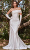 Cinderella Divine CD979W luxe jersey wedding dress is perfect for the bride with a classic sense of style. This exquisite gown has a fitted bodice with ruching, a hidden sweetheart neckline, and asymmetric sleeves that can be worn on or off-the shoulder. The skirt parades into a full-length trumpet silhouette while flaunting a side slit. This outfit is finished off with detachable gloves and a trailing, sweeping train. For the bride who wants to radiate classic sophistication while living out her modern-day fairytale, this Cinderella Divine wedding gown is perfect.