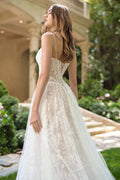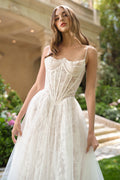 Walk down the aisle in timeless elegance with the Ladivine WL069, a stunning sleeveless bridal gown that captures romance in every detail. This A-line masterpiece features intricate floral lace layering and pearl-beaded embellishments that shimmer beautifully throughout the day. The structured corset bodice with exposed boning and delicate illusion straps creates a refined silhouette, while the open lace-up back adds an alluring modern touch. Flowing tulle and lace blend seamlessly into a dramatic chapel train, perfect for garden ceremonies or intimate outdoor celebrations. Fully lined for comfort and available in sizes 4-20, this versatile gown transitions effortlessly from weddings to formal galas and special occasions.