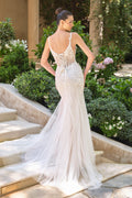 Discover timeless sophistication with the Ladivine WL066, a sleeveless bridal masterpiece that seamlessly blends contemporary allure with romantic tradition. This stunning fit-and-flare gown features an illusion V-neckline adorned with delicate floral appliqué that gracefully flows into a sheer, tiered tulle skirt. Beaded embroidery catches the light beautifully, while the lace-up corset back creates a perfectly sculpted silhouette. Thin straps and a dramatic floor-length trumpet skirt with flowing train complete this show-stopping design. Crafted from premium tulle with intricate appliqués and embellishments, this gown is fully lined for comfort and confidence. Whether you're walking down the aisle or making an entrance at a formal event, this versatile dress delivers the elegance and modern edge every bride deserves. Available in sizes 4-16.