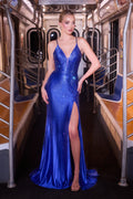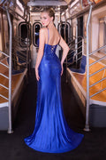 Captivate every room in this stunning Ladivine CB163 gown, where sophisticated elegance meets modern glamour. The plunging illusion V-neckline and delicate spaghetti straps frame your silhouette beautifully, while intricate heat-set beading creates a mesmerizing linear pattern that sculpts and lengthens your figure. Crafted from luxurious stretch fabric, this sleeveless design hugs your curves with effortless grace. The dramatic thigh-high slit commands attention, while the adjustable lace-up corset back ensures a personalized fit. With its floor-length silhouette, bra cup support, and full lining, this gown delivers red-carpet-worthy sophistication for prom, galas, pageants, and unforgettable formal occasions. Available in Royal Blue and Silver, sizes 0-14.