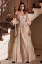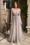 You'll absolutely love twirling around in this beautiful embellished long off-the-shoulder dress by Cinderella Divine B715. This beautiful gown features a sweetheart bodice, off-shoulder sleeves, an open back, and a full length A-line skirt that ends in a sweep train.
