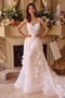 - Skirt: Floor-length A-line skirt with a graceful sweep train and a romantic side leg slit.