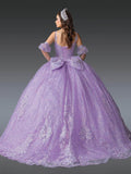 The Dancing Queen 1907 is a masterpiece of regal design, blending rich beaded embroidery with shimmering glitter accents throughout. The sleeveless bodice and sweetheart neckline frame the upper silhouette, while detachable puffed off-shoulder sleeves add drama and elegance. The voluminous skirt showcases glitter embellishments that shines from every angle. Finished with a lace-up back, the Dancing Queen 1907 is ideal for anyone wanting to make an opulent statement at grand events or milestone celebrations. Model is wearing Lilac color.