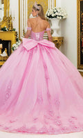 | Details: | Off Shoulder Sleeves, Lace Up Back, Floral Applique, Embroidery, Beaded, Sheer Corset Bodice, Oversized Back Bow |
