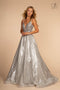 Command attention in this beaded long glitter v-neck dress with sheer bodice by Elizabeth K.