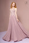 Think of how amazing you'll look in this long glitter v-neck champagne dress with sheer sides by Elizabeth K.