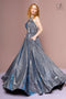 Command attention in this long illusion v-neck satin dress with beaded bodice by Elizabeth K.