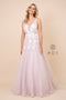 Look unforgettable in this long tulle V-neck dress with bead embroidered bodice by Nox Anabel G390. This evening gown features a sleeveless V-neck sheer bodice adorned with embroidery that's accented with rhinestones, spaghetti straps, illusion open V-back, a floor length A-line skirt with a side leg slit, and a zipper closure.