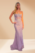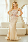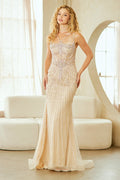 Step into the spotlight in this exquisite beaded tulle evening gown by Amelia Couture 2134. This sleeveless masterpiece features a romantic illusion sweetheart neckline with structured corset boning and an alluring open back finished with a zipper closure. Adorned with shimmering beads and glitter throughout, the fitted bodice flows into a floor-length skirt with an elegant train and horsehair hem for impeccable movement. Crafted from luxurious tulle with a fully lined interior and built-in bra cup, this gown delivers both comfort and confidence. Available in champagne, dark mauve, and sage green in sizes 2-16, it's the perfect choice for prom, galas, red carpet events, and unforgettable formal occasions.