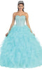 May Queen LK144: A strapless gown with a sweetheart neckline, corset bodice, and embellishments. It has a voluminous ballgown silhouette.