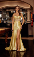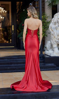 Sleek satin strapless prom dress by Nox Anabel featuring a beaded fitted corset bodice with satin pleating at the bust, a sweetheart neckline, a small keyhole cutout in the front, and an adjustable lace-up open back. The smooth flowy floor-length satin skirt with a daring high-leg slit completes the glamourous look.