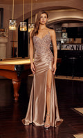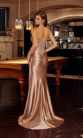 Strapless prom dress by Nox Anabel with a fitted bodice heavily embellished with sparkling beadwork that cascades down the side waist into the smooth floor-length satin skirt. This design has a daring high-leg side slit, ruching in the lower back, and a midrise open back with a zipper closure.