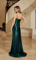Sleeveless long sleek satin prom gown by Nox Anabel. This elegant design features a fitted corset bodice with delicate spaghetti straps, shimmering embellishments lining the v-neckline and the hips, a pleated side, and an open back with a zipper closure. The sleek satin sheath skirt features a dramatic high-leg slit and flows gracefully to the floor into a sweep train.