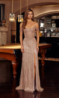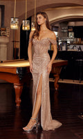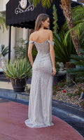 Sparkling prom gown by Nox Anabel fully adorned with with vertical linear beading patterns and embellishments from the neckline to the hem. This design features off-the-shoulder draped sleeves, a sweetheart neckline on the fitted corset bodice, a midrise open back with a zipper closure, and a high-leg slit in the fitted floor-length sheath skirt.