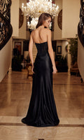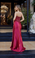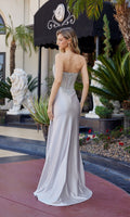 Shimmering strapless prom dress by Nox Anabel with a beautiful sheer fitted corset bodice adorned with intricate sequin-embellishments and a glitter stretch satin floor-length skirt. This design features a sheer deep v-neckline, a midrise open back with a zipper closure, gathering at the natural waistline, a high-leg slit, and a side sash from the hips that falls gracefully to the floor.