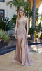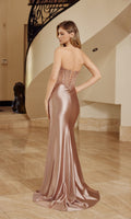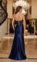 Effortlessly elegant strapless prom dress by Nox Anabel featuring a fitted corset bodice adorned with shimmering beaded embellishments, a scoop neckline, and an adjustable lace-up open back. The dress transitions to a satin jersey floor-length skirt with a fitted sheath silhouette and a high-leg slit for an overall sleek and sexy look.