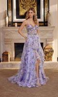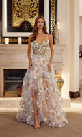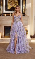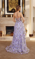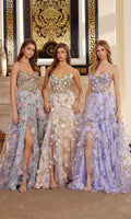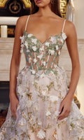 Flower prom dress by Nox Anabel featuring a floral print chiffon fabric with 3D flower appliques. This long floral prom dress also features thin shoulder straps, a sheer corset bodice, an a-line flowy skirt, and an open back with an adjustable tie.