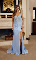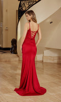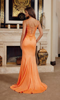 Sleeveless shimmering prom dress by Nox Anabel featuring a sheer fitted corset bodice with beaded lace-embroidery that cascades down the sides to the hips. This design features spaghetti straps, a v-neckline, and an adjustable lace-up open back. The shiny stretch satin skirt with a high-leg side slit hugs the curves and flows gracefully to the floor to finish the glamourous look.