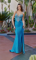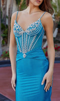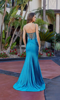 Sleeveless floor-length prom dress by Nox Anabel featuring a crystal-embellished sheer fitted corset bodice with a sweetheart neckline and thin embellished shoulder straps. The dress has an adjustable lace-up open back and a sleek fitted satin skirt that hugs the curves and flares out to flow gracefully to the floor into a short sweep train.