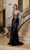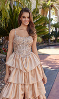 Sleeveless prom gown by Nox Anabel with a sheer fitted shimmering sequin-embroidered bodice, delicate spaghetti straps, and an adjustable lace-up open back. The dress transitions to a beautiful ruffle tiered full-length organza a-line skirt with a thigh-high slit for a statement look.