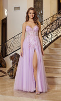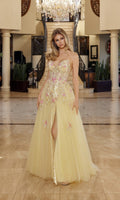 Strapless prom dress by Nox Anabel featuring a sheer fitted corset bodice with intricate embroidery, 3D floral appliques, and scattered beads and sequins. The dress transitions to a full-length tulle a-line skirt with scattered 3D floral appliques at the waist, a subtle sweep train and a dramatic high-leg front slit.