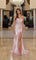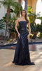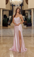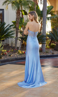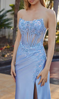 Strapless shiny satin dress by Nox Anabel with a sheer-embroidered corset bodice and a wrap-style floor-length fitted sheath skirt. The dress features a straight neckline, embroidery cascading down from the bodice to the waist and hips, an adjustable lace-up open back, a daring high-leg slit and sweep train for a polished elegant look.