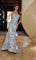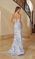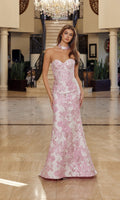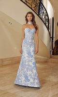 Long form-fitting textured prom dress crafted from a floral brocade fabric and featuring a corset bodice, a strapless sweetheart neckline, an adjustable lace-up back, and a matching choker.