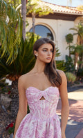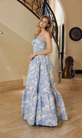 Textured floral brocade prom dress by Nox Anabel featuring a strapless sweetheart neckline, a front cut out in the structured corset bodice, an adjustable lace-up back, and a full a-line skirt.