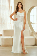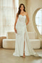 Make a striking entrance in this strapless lace and satin gown by Amelia Couture 9077. Featuring an intricately embroidered lace bodice with structured boning for a flattering silhouette, this dress commands attention with its elegant sweetheart neckline and dramatic open back. The luxurious satin skirt flows into a fitted mermaid cut, accented by a ruched hip detail and a daring thigh-high slit that balances sophistication with modern edge. Fully lined with a convenient zipper closure, this versatile gown transitions seamlessly from wedding receptions to formal galas and red carpet events. Available in sizes 0-16, it's the show