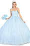 May Queen LK161: An enchanting evening gown with 3D floral appliques, embroidery, and beaded accents. It has an off-shoulder sweetheart neckline, a corset lace-up back, and a voluminous ballgown silhouette with a sweep train. Suitable for formal events.