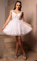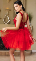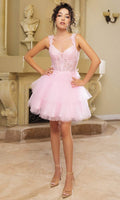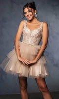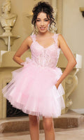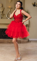 Be the embodiment of pure feminine flair in this mesmerizingly ornate May Queen MQ2116 cocktail dress. This dress showcases an endearing V-neckline on a fitted and sleeveless bodice. It also reveals a classy mid-open back that is secured with lace for a graceful finish. The illusion top displays boning details and is beautifully adorned with floral embroidery, while the mid-thigh A-line skirt exhibits captivating tiered ruffle designs. Show off your bubbly and pleasant personality with this May Queen MQ2116 masterpiece. Models are wearing Champagne, Lilac, Off White, Pink, Red, Sage, and Silver colors.