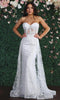 May Queen RQ7884: Have a blast in this fashionable evening gown. It showcases a fitted bodice with floral appliques, a plunging V-neckline with a mesh inset, an open back, and a sheath silhouette with a thigh-high leg slit and a dramatic sweep train.