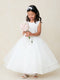 This exquisite ankle-length flower girl dress is crafted to make her special occasion truly memorable. Featuring a luxurious satin bodice with an illusion neckline embellished with scattered pearls, it exudes elegance and sophistication. A detachable pearl and rhinestone sash adds subtle sparkle, while the voluminous mesh skirt offers a graceful, twirl-worthy silhouette. The back includes a center zipper and adjustable sash tie for a perfect fit, complemented by a sheer mesh panel adorned with pearl details. Fully lined for comfort, this dress is perfect for weddings, communions, pageants, or any event where she should stand out.