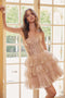 Experience the "wow" factor with this stunning Nox Anabel T870 short dress adorned with intricate embroidered appliqué and a sleek slit skirt!